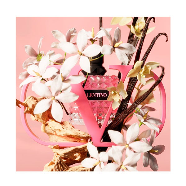 O frasco está coberto com os icônicos studs, tachas inspiradas pela arquitetura de Roma, que são a assinatura característica de Valentino. Estes também envolvem o pescoço do frasco, transformando-o em um acessório de moda.