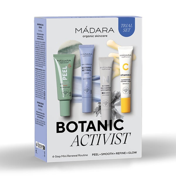 O conjunto Botanic Activist inclui quatro fórmulas inovadoras MÁDARA em formato miniatura para minimizar a aparência de textura e tom desiguais, e combater a perda de elasticidade e luminosidade. Sua fórmula é projetada para ser eficaz sem irritar a pele.