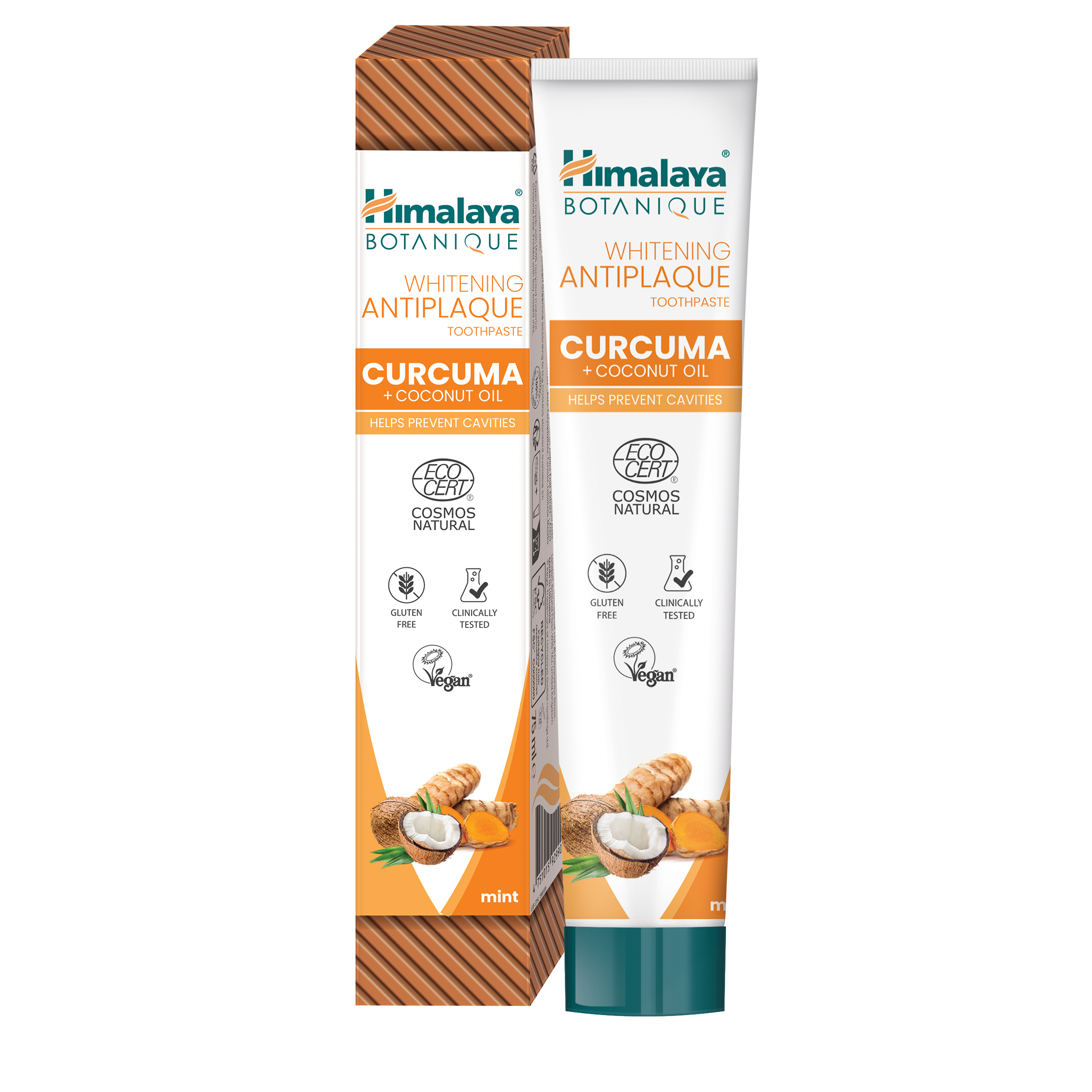 A pasta de dentes Clareadora ANTIPLACA Cúrcuma + Óleo de Coco do Himalaia Botanique é feita com Cúrcuma, que acalma, Neem, que combate os germes, e Óleo de Coco, que adoça e combate a placa, para ajudar a prevenir as cáries.