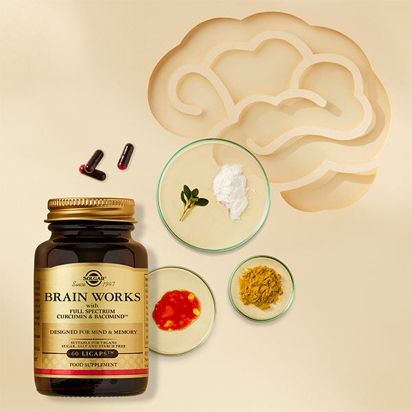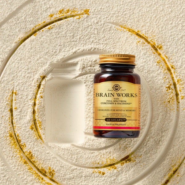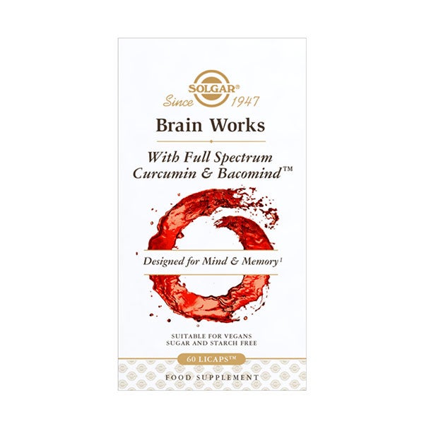 Brain Works com Full Spectrum Cúrcuma e BacoMindTM da Solgar® está projetado para fortalecer a mente e a memória de adultos mais velhos e jovens adultos. Reunindo cuidadosamente o poder dos ingredientes botânicos tradicionais e os ingredientes cientificamente estudados nesta fórmula vegana única.