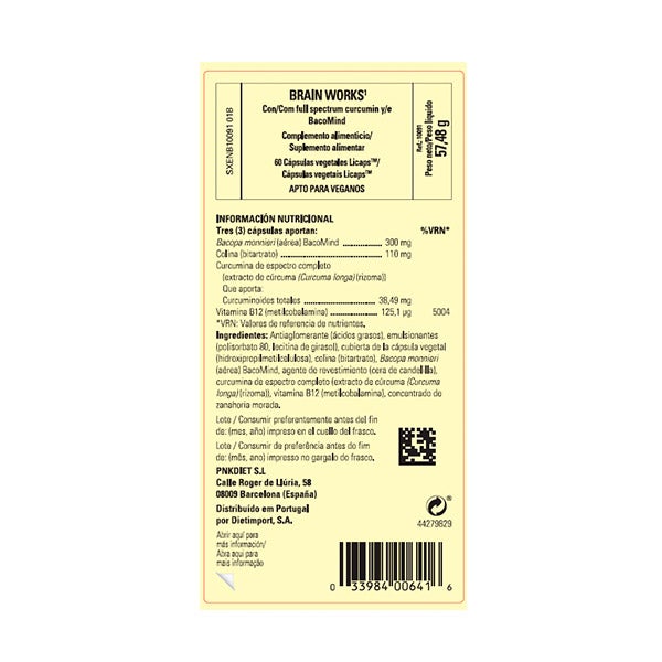 Contém extrato de Bacopa monnieri (BacoMindTM), vitamina B12 (metilcobalamina), colina e cúrcuma patenteada (Full Spectrum Cúrcuma).