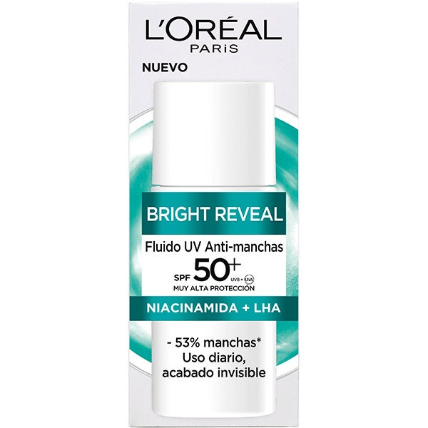 Bright Reveal Fluido Hidratante Anti-manchas com Filtro UV SPF50+ e Niacinamida da L'Oréal Paris para recuperar a uniformidade da sua pele.