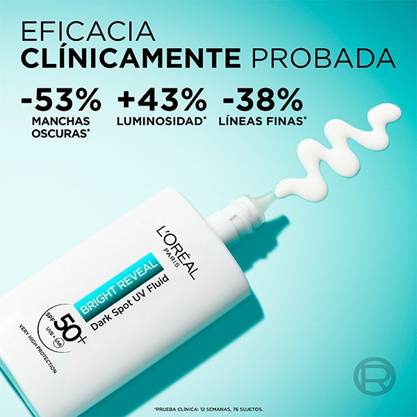 Desperte a luminosidade da sua pele com o Bright Reveal Fluido Hidratante Anti-manchas com Filtro UV SPF50+ e Niacinamida da L'Oréal Paris. Este inovador Fluido diário, de alta proteção solar, protege, ajuda a prevenir e corrige visivelmente as manchas.