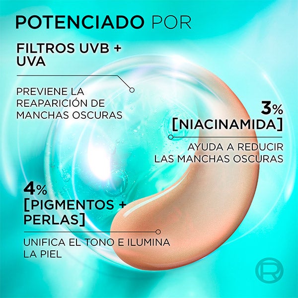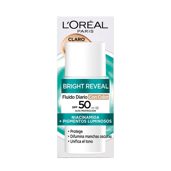 Desperte a luminosidade da sua pele com o Bright Reveal Fluido Diário Com Cor com Filtro UV SPF50 e Niacinamida da L'Oréal Paris. Este inovador fluido diário, de alta proteção solar, protege, ajuda a prevenir e corrige visivelmente as manchas. Sua fórmula avançada com Niacinamida disfarça visivelmente as manchas escuras, transformando sua pele e deixando-a com um aspecto mais uniforme e jovem.