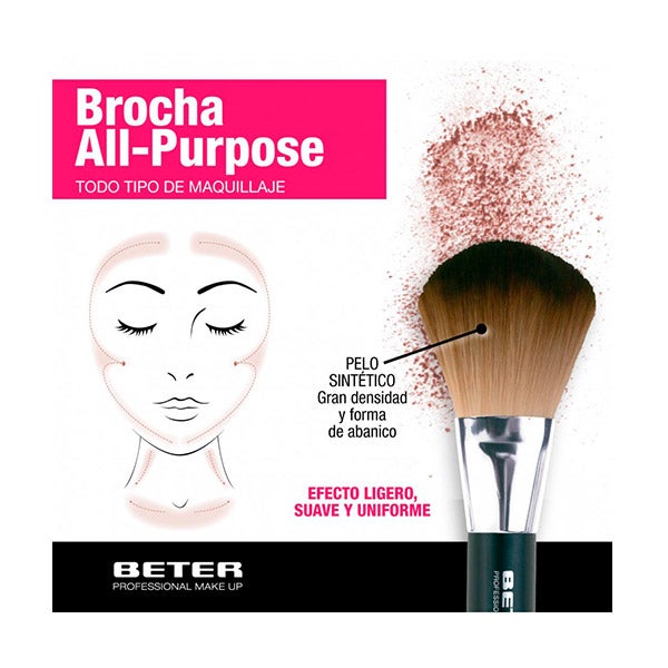 O pelo sintético do Pincel para pós curto da Beter proporciona uma sensação de suavidade ao toque, uma aplicação homogênea graças à sua grande densidade e seu acabamento em forma de leque.