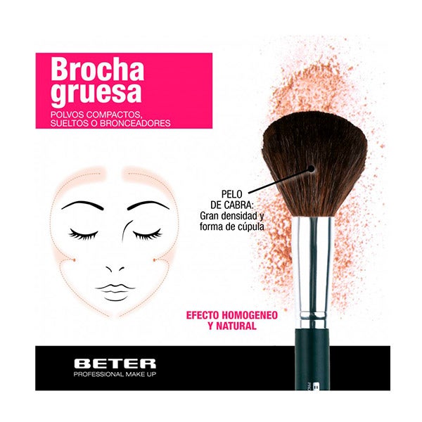Consiga uma maquiagem completa e de acabamento perfeito com o pincel de pó grosso da Beter. Você poderá aplicar todos os tipos de pós com este pincel: compactos, soltos ou bronzeadores. A forma em cúpula dos pelos e a densidade destes conseguem uma maquiagem homogênea por toda a extensão do rosto. Brônzea e ilumina seu rosto com Beter.