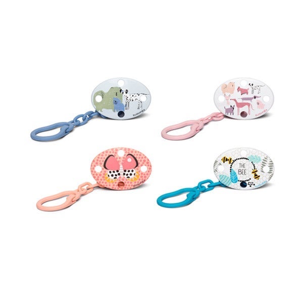 Prendedor que permite segurar a chupeta à roupinha do seu bebê, evitando que caia no chão e se suje ou se perca.