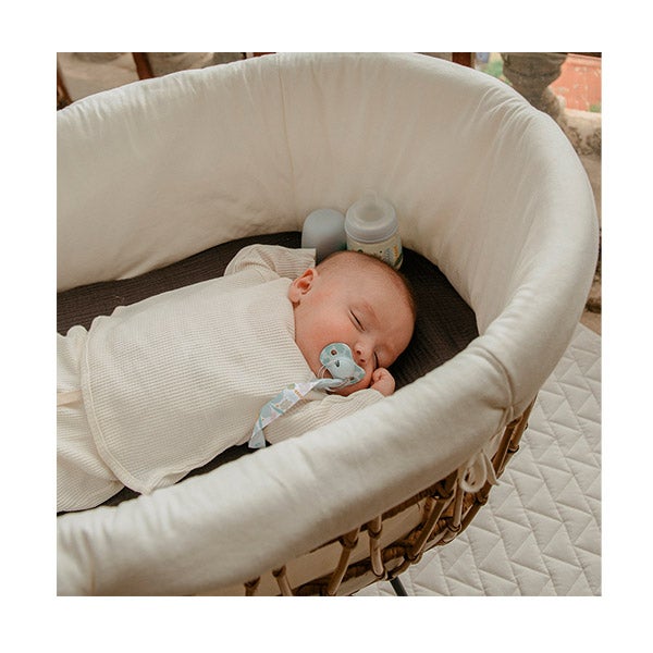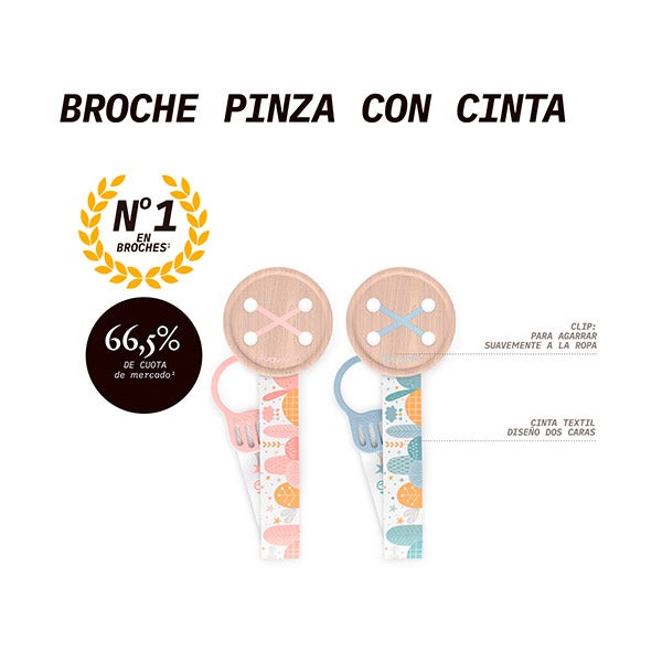 Broche clip com fita têxtil. Este broche permite prender as chupetas à roupinha do bebê, evitando assim que caiam no chão, se sujem ou se percam. Para bebês a partir de 0 meses.