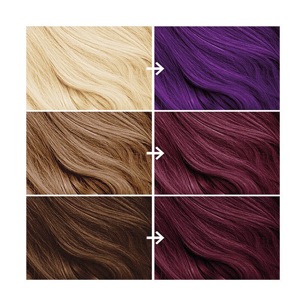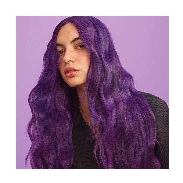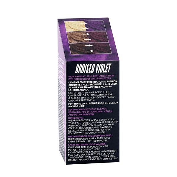O que faz? Bruised Violet é uma tinta semipermanente condicionadora que transforma o cabelo em um roxo vibrante e espetacular que dura entre 10 e 50 lavagens.