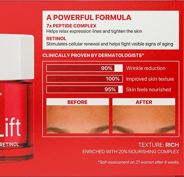 Creme de noite antirrugas nutritivo, com um complexo avançado de 7 peptídeos e retinol encapsulado.