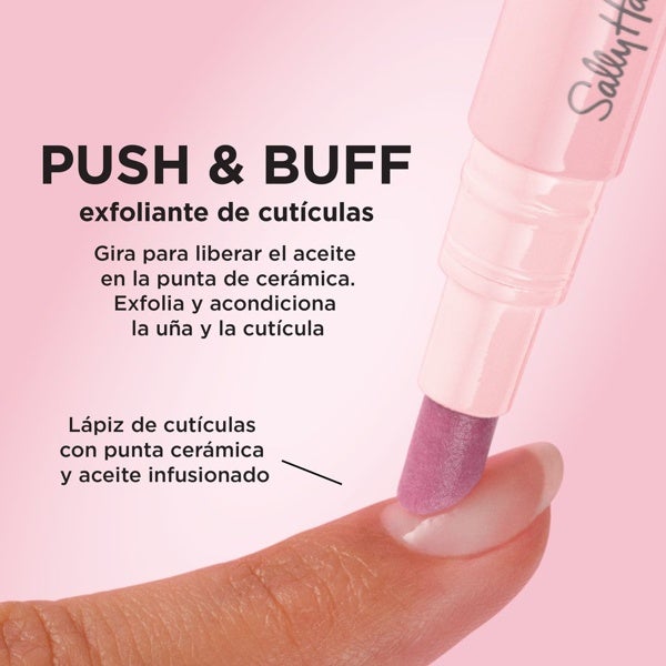 Cutículas cuidadas em um só passo! Descubra o Push & Buff da Sally Hansen, que esfolia e condiciona as cutículas de forma simples com sua fórmula infundida em óleos de Centella Asiática, Amêndoa Doce e Damasco. Sua ponta cerâmica texturizada polida suavemente e remove o excesso de pele, deixando as unhas limpas, lisas e com um acabamento impecável.