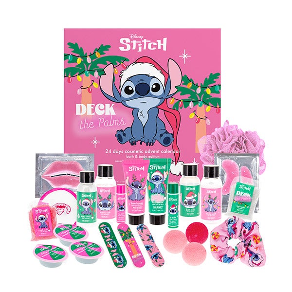 Contagem regressiva para o Stitchmas com estilo com nosso mágico calendário do advento inspirado no Stitch da Disney, que inclui 24 deliciosos mimos para o banho, o corpo e a beleza.