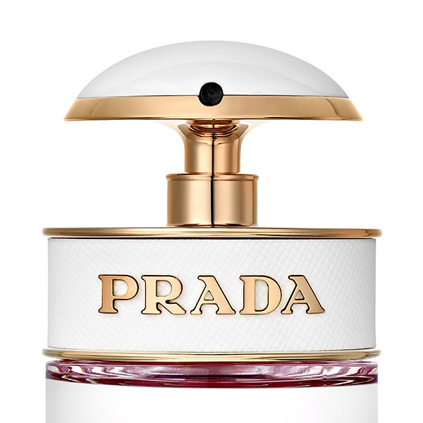 O design do frasco de Prada Candy Kiss é puro e iluminado por lampejos de lábios rosados com um motivo de beijo. A garrafa brilha em branco e dourado, seu fundo curvo lacado irradia vibrantes tons rosados no líquido da fragrância.