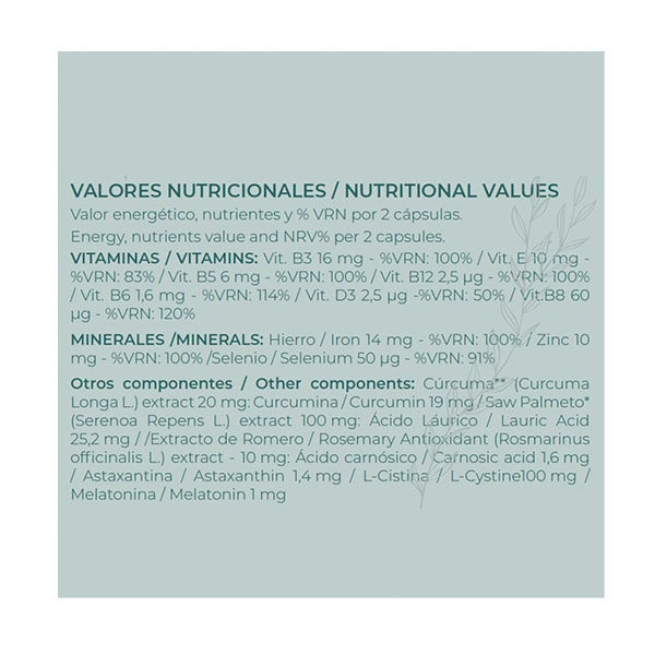 Vitaminas B5, B6, B12, B3, E, D3, selenio, zinc, biotina, cistina, melatonina