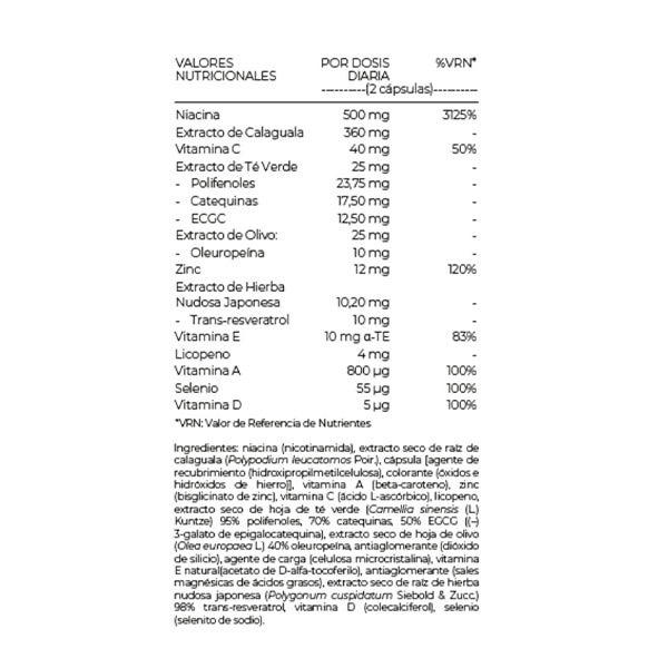 Niacinamida, betacaroteno, licopeno, Polypodium leucotomos, té verde, resveratrol, vitaminas A, C, D, E, zinc y selenio