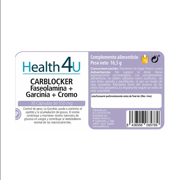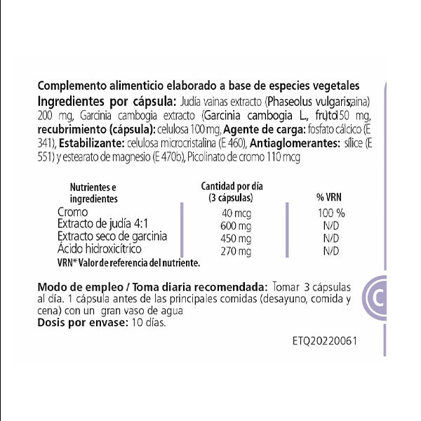 Ingredientes por cápsula: Judía vainas extracto (Phaseolus vulgaris) 200mg, Garcinia cambogia extracto (Garcina cambogia L) 150mg. Recubrimiento (cápsula): celulosa 100mg, Agente de carga: fosfato cálcico (e-341), Estabilizante: celulosa microcristalina ( E 460), Antiglomerantes; sílice (E551) y estearato de magnesio (E 470b), Picolinato de cromo 110 mcg