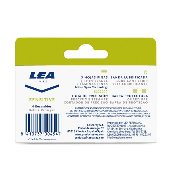 Recarga para o sistema de barbear LEA SENSITIVE 5. Cabeça com 5 lâminas mais 1 lâmina de precisão com tecnologia micro span, perfeitamente alinhadas para um barbear perfeito e suave. A cabeça oscilante com faixa lubrificada desliza suavemente adaptando-se ao contorno do rosto. Lâminas com geometria aberta facilitam a limpeza e enxágue.