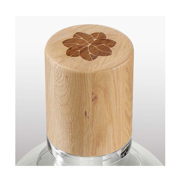 O frasco de vidro emula a base de uma garrafa de vinho.