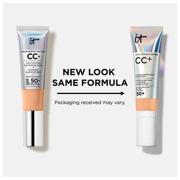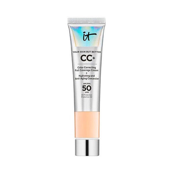 Desenvolvida com cirurgiões estéticos e dermatologistas, a CC+ Cream da IT Cosmetics oferece uma cobertura total proporcionando à sua pele um acabamento natural, cuida da sua pele com um tratamento antienvelhecimento e hidratante e a protege graças ao seu filtro solar de amplo espectro com SPF 50 UVA/UVB. Para todos os tipos de mulheres, independentemente da sua idade ou tipo de pele. Disponível em 13 tons.