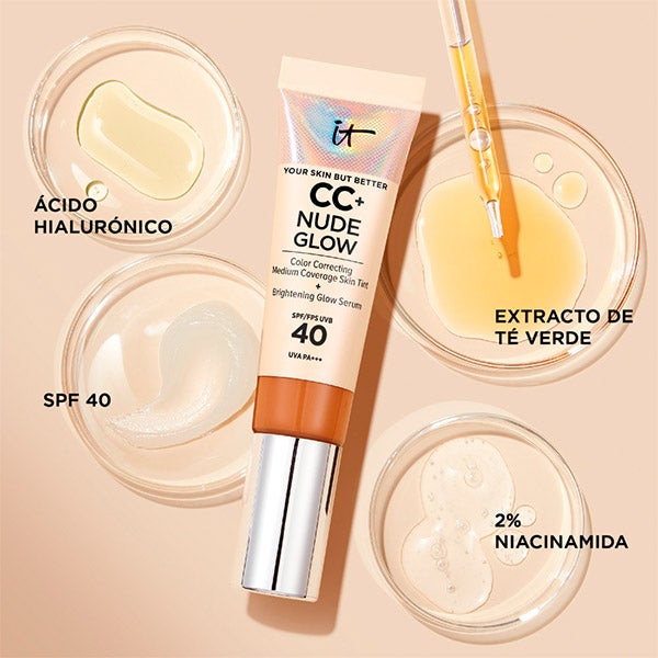 Obtén una piel más luminosa e hidratada al instante con CC+ Nude Glow con SPF 40, una base de maquillaje de cobertura media con un acabado glow. Con un 90% de productos que cuidan de la piel, nuestra fórmula contiene sérum iluminador con un 2% de niacinamida, ácido hialurónico, extracto de té verde y SPF 40.