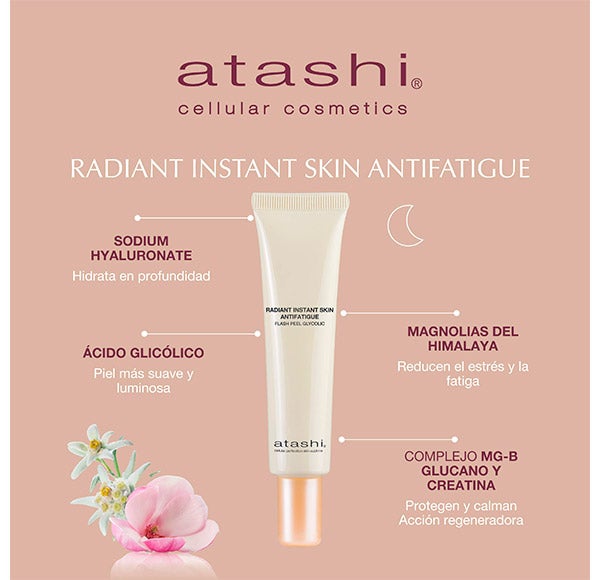 Radiant instant skin antifatigue é um gel efeito flash peeling de textura fluida de máxima penetração que atua sobre a pele remetendo de forma instantânea os sinais do passar do tempo. O cutis recupera toda sua magnificência e resplendor, a pele se torna mais suave, firme e sem imperfeições ao mesmo tempo que as rugas se atenuam.