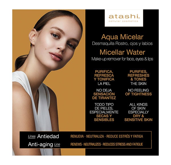 O aqua micelar atashi cellular cosmetics é um removedor de maquiagem para o rosto, olhos e lábios das peles mais sensíveis e secas.