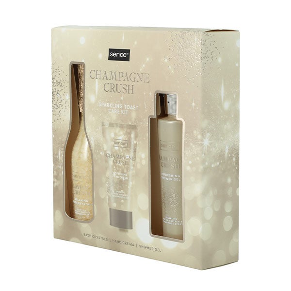 Descubra o Kit de Cuidados Sence Night Luxe Golden Toast. Dentro, você encontrará uma festiva garrafa de champanhe cheia de Sal de Banho Perolado, um refrescante Gel de Banho e um nutritivo Creme para Mãos, tudo elegantemente embalado em uma caixa luxuosa.