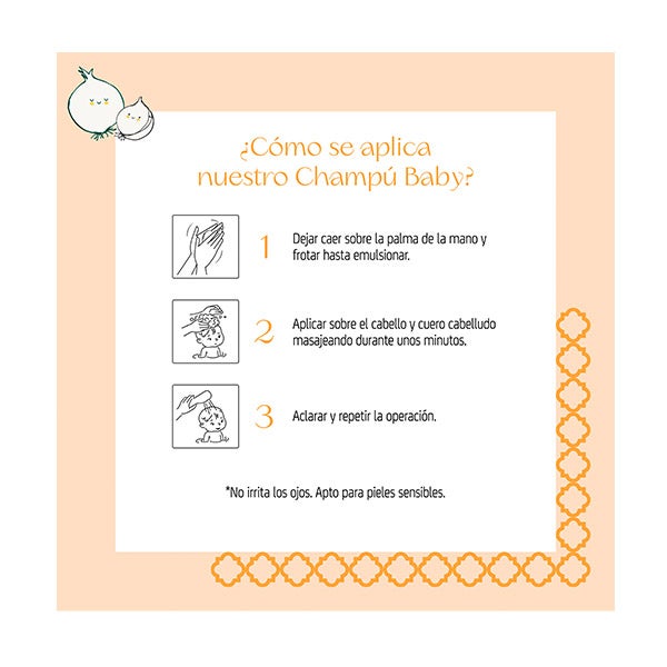 Aplicar suavemente sobre o cabelo e couro cabeludo do bebê, massagear por alguns minutos e enxaguar bem.
