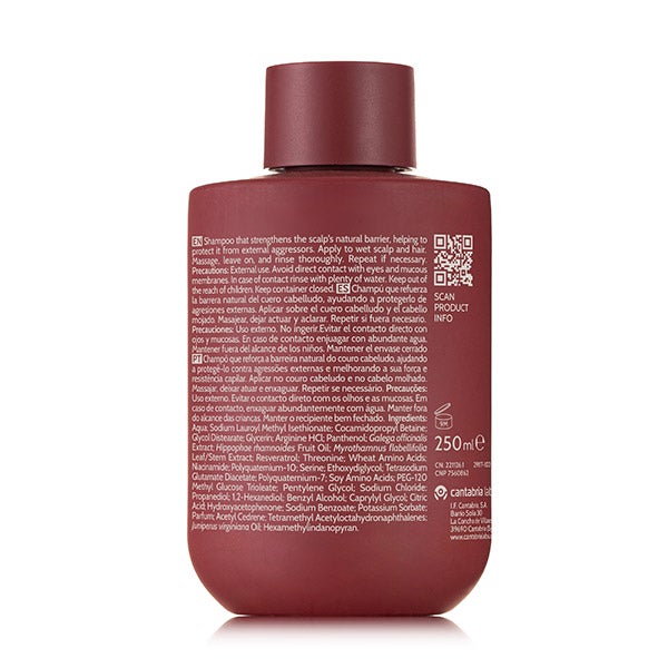 Enriquecido com niacinamida, conhecida por sua capacidade calmante. Combate o envelhecimento capilar graças à exclusiva tecnologia de Cantabria Labs, MetforHair®, que potencializa a resiliência capilar para um cabelo mais jovem e protegido.