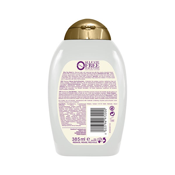 OGX Coconut Miracle Oil Shampoo (385 ml), shampoo anti-frizz com óleo de coco, essência de tiaré e extrato de baunilha, shampoo sem sulfatos nem parabenos para cabelo seco e danificado