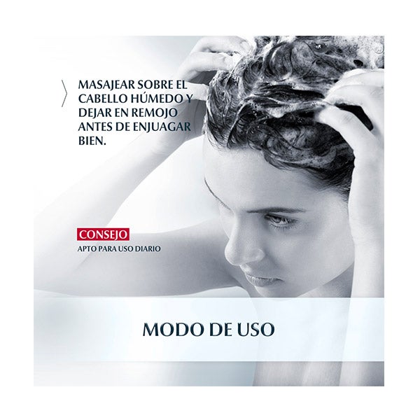 Aplique com uma massagem no cabelo úmido. Deixe que penetre bem no cabelo antes de enxaguar completamente.
