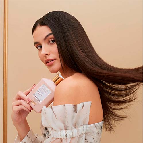 Cabelo protegido, penteável, brilhante. Liso, disciplinado e definido.