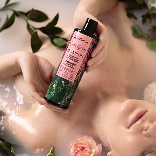O alecrim também estimula o crescimento do cabelo. O shampoo para cabelo oleoso também contém extrato de cardo, que fortalece o cabelo e o protege de fatores externos nocivos.