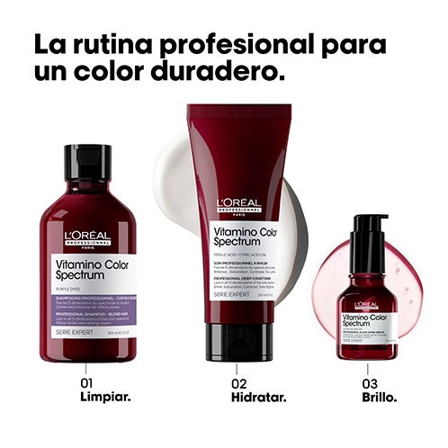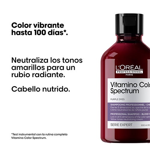 Descubra o novo L'Oréal Professionnel Vitamino Color Spectrum Purple Shampoo. É um shampoo especializado na neutralização de tons amarelados em cabelo loiro, descolorido ou com mechas.