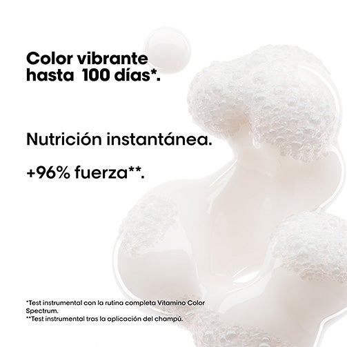 Descubra o novo L'Oréal Professionnel Vitamino Color Spectrum. É um shampoo profissional projetado para proteger e prolongar a cor do cabelo colorido. Com uma fórmula enriquecida com ácido ferúlico e ácido cítrico, este shampoo ajuda a manter a cor vibrante por até 100 dias*.