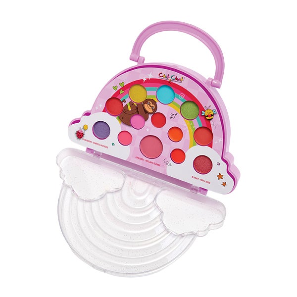 Um lindo estojo de maquiagem em forma de arco-íris, recheado de sombras de olhos, brilhos labiais e blush. O estojo é até reutilizável, então você pode preenchê-lo com todas as suas coisas favoritas!
