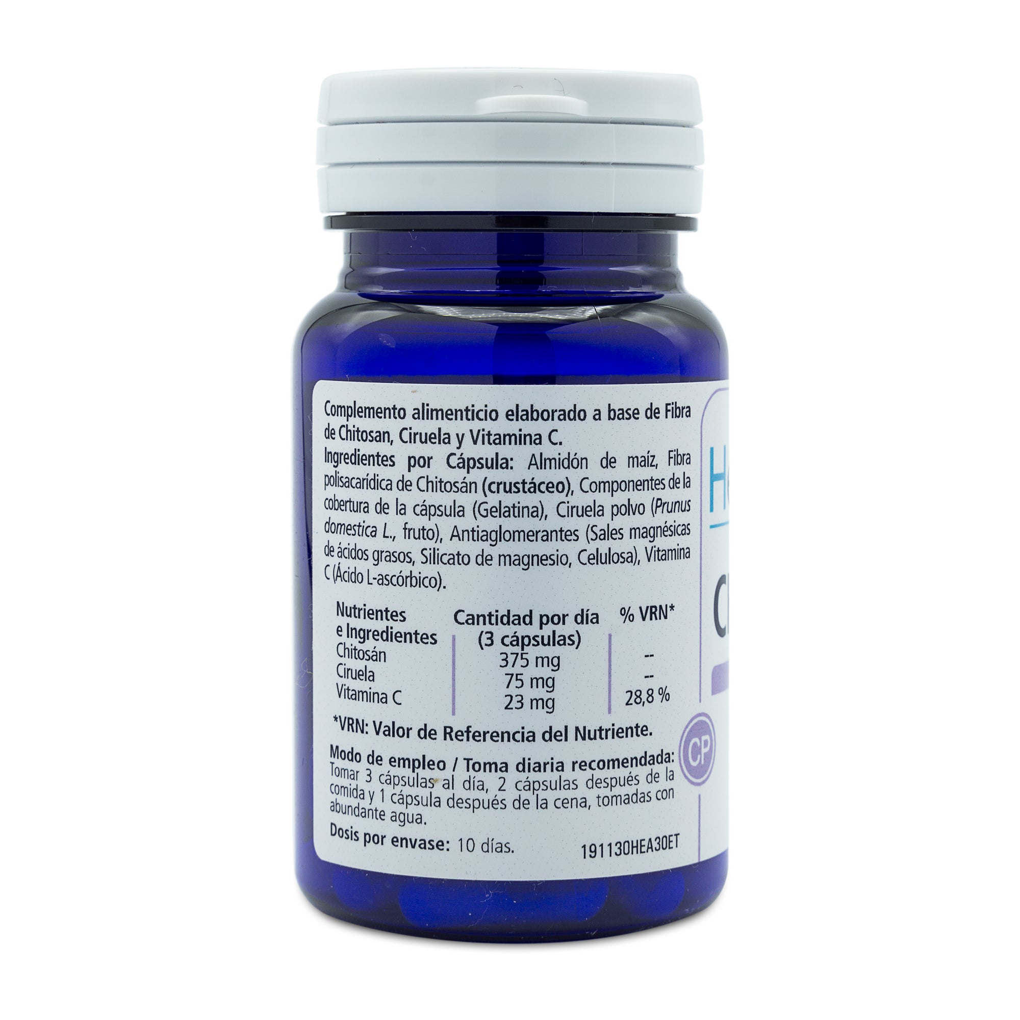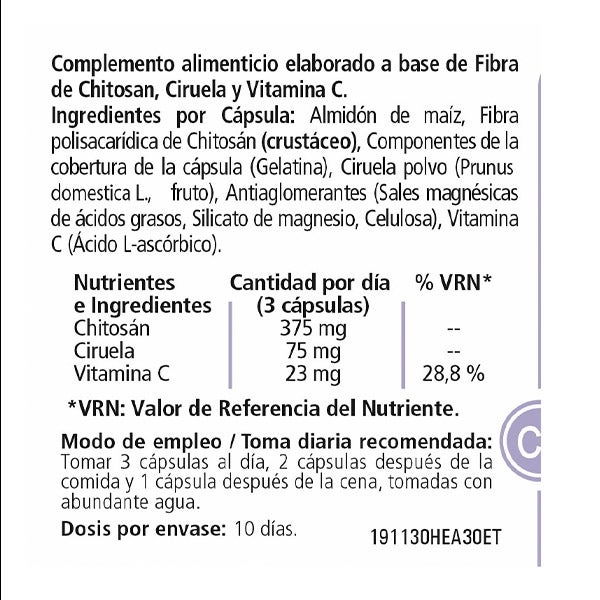 Ingredientes por cápsula: Almidón de maíz, Fibra polisacarídica de Chitosán ( Crustáceo ) , componentes de la cobertura de la cápsula (Gelatina) Ciruela en polvo ( Prunus domestica L, fruto ), Antiaglomerantes(Sales magnésicas de Ácidos grasos, Silicato de magnesio, Celulosa ) Vitamina C (Ácido L-ascórbico ) Componentes de la cápsula: Gelatina y agua
