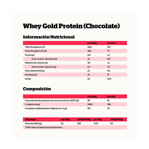 Novo Whey Gold Protein com DigeZyme® com os benefícios de sempre e, além disso, enriquecido com DigeZyme®. Whey Gold Protein é uma proteína de soro de leite de máxima qualidade, composta unicamente por concentrado de soro lácteo (WHEY). É perfeita para depois do treino, pois contribui para a conservação ou aumento da massa muscular graças à sua rápida absorção.