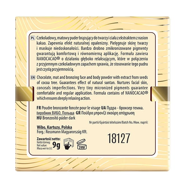 Pó bronzeador mate de chocolate para o rosto e corpo, com extrato de sementes de cacau.