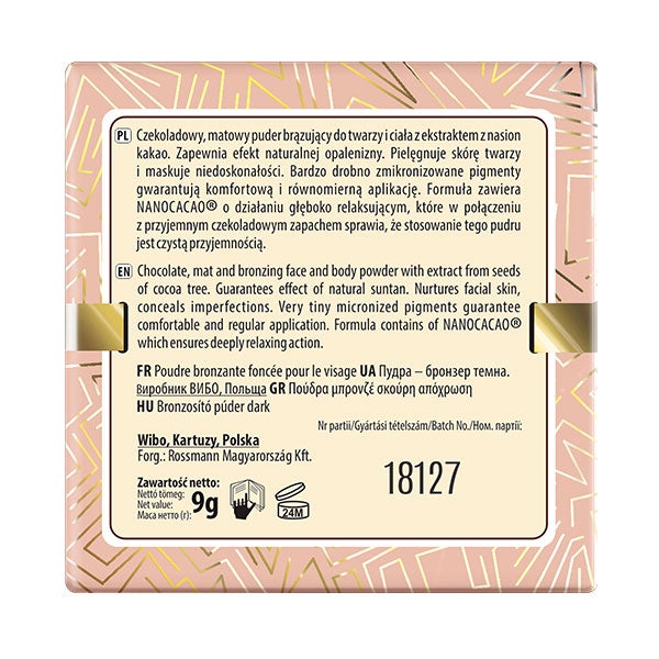 Pó bronzeador mate de chocolate para o rosto e corpo, com extrato de sementes de cacau.