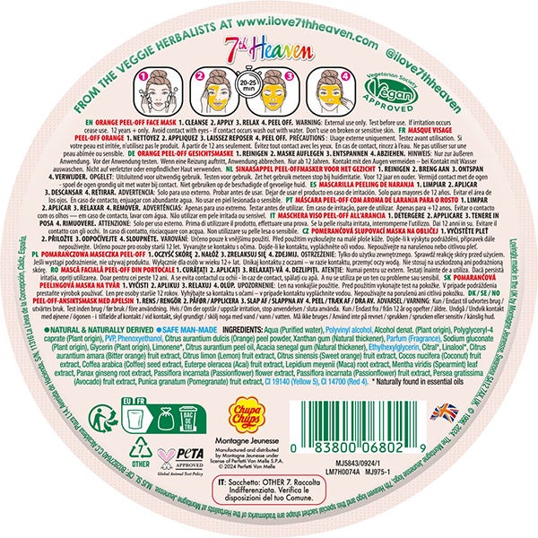 Elimina suavemente as impurezas, desobstrui os poros e promove uma pele brilhante e suave com a nossa MÁSCARA PEEL-OFF ORANGE CHUPA CHUPS. Contém o poder esfoliante da casca de laranja para revelar uma pele fresca, suave e radiante.