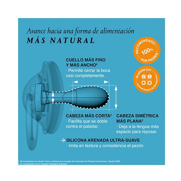 - Silicone fino ultra-suave com acabamento jateado: Imita em textura e consistência o mamilo materno, conseguindo a máxima calidez e um movimento super flexível que adapta a tetina à cavidade palatina.