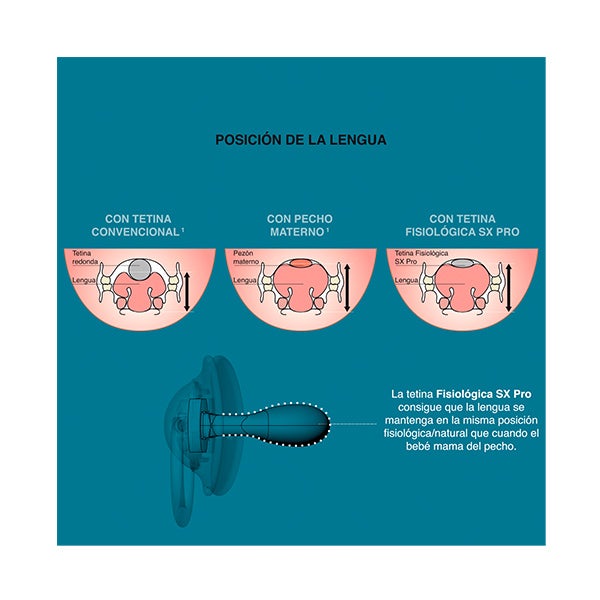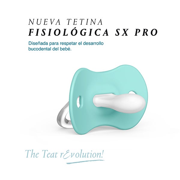 A nova tetina Fisiológica SX Pro está pensada para não invadir a cavidade oral e proporcionar ao bebê a mesma sensação que experimenta em seu estado natural/fisiológico quando não usa chupete.