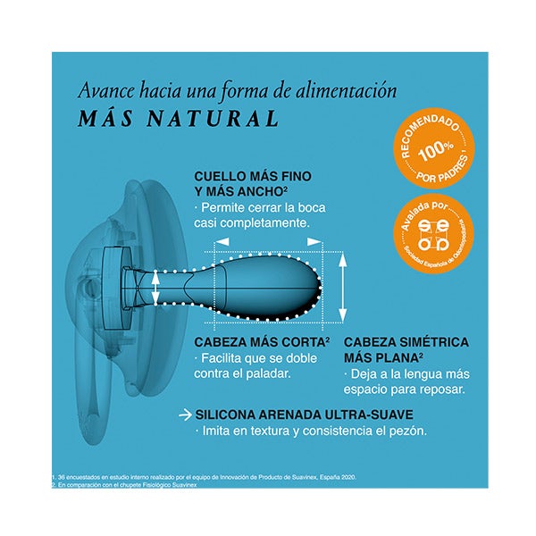 - Silicone fino ultra-suave com acabamento jateado: Imita em textura e consistência o mamilo materno, conseguindo a máxima calidez e um movimento super flexível que adapta a tetina à cavidade palatina.