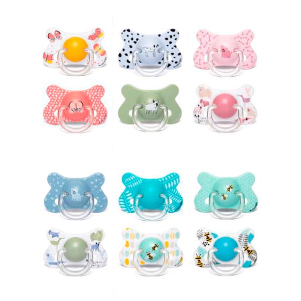 Pacote de 2 chupetas Prêt-à-porter com bico anatômico de látex ou silicone e bico fisiológico de silicone para bebês de 4 a 18 meses.