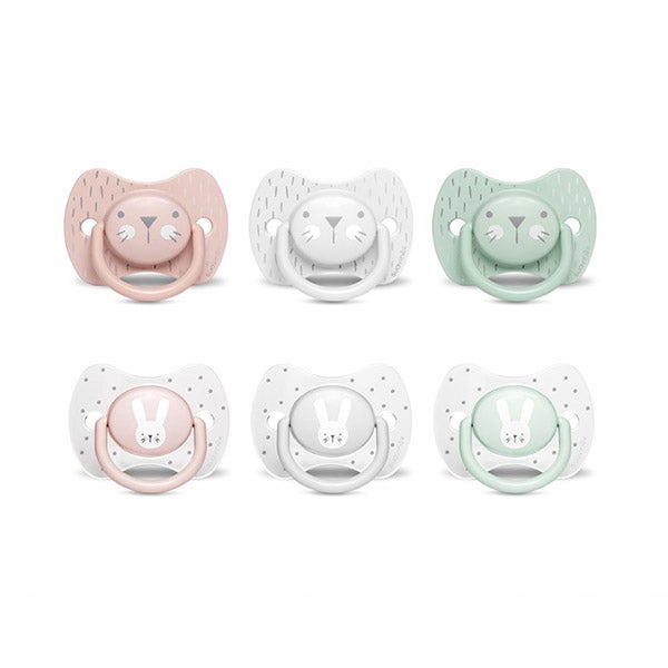 Chupetas em tamanho 0/6 meses com bico fisiológico de silicone.