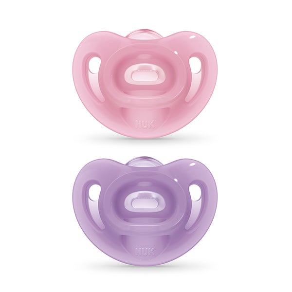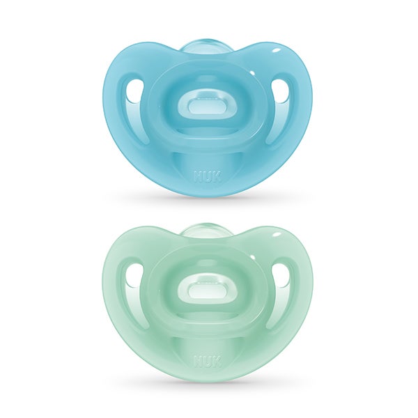 O chupeta NUK Sensitive é totalmente feito de silicone para se adaptar ao rosto do bebê, aliviando até os recém-nascidos mais pequenos.