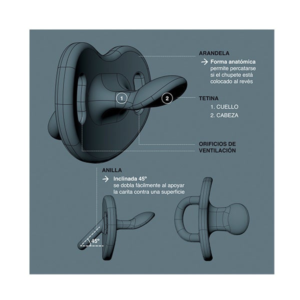 - Silicone fino ultra-suave com acabamento jateado: Imita em textura e consistência o mamilo materno, conseguindo a máxima calidez e um movimento super flexível que adapta a tetina à cavidade palatina.