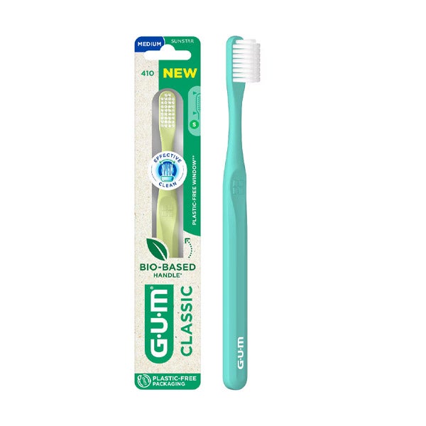 A escova de dentes Classic Médio da marca GUM é projetada para a higiene bucal. Suas cerdas Dome-Trim permitem uma limpeza profunda abaixo da linha das gengivas, onde a placa se acumula. O cabo é fabricado com material 100% de origem biológica, proporcionando uma pegada confortável e adaptando-se à mão. A escova é apresentada em uma embalagem sem plástico, contribuindo para a redução de resíduos e promovendo uma rotina de cuidado dental mais sustentável.