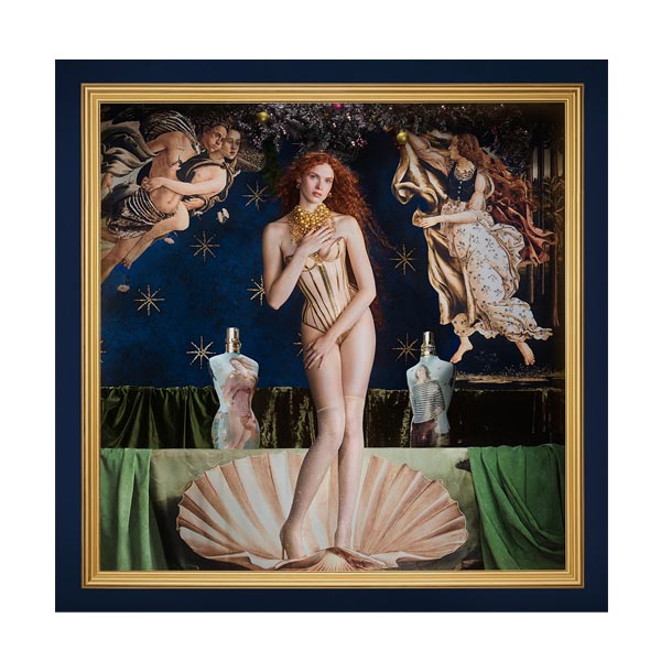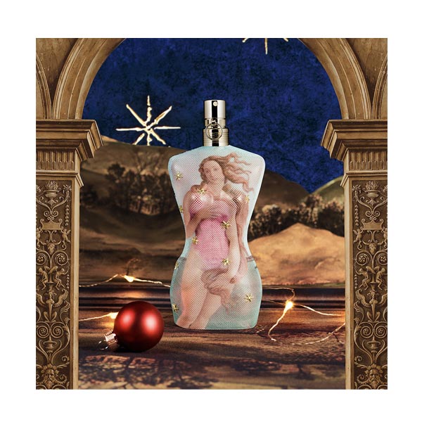 Em uma moldura dourada digna das obras-primas do Renascimento, os Collectors de Natal revivem o Nascimento de Vênus de Botticelli e o São Sebastião de Perugino com um toque ousado e moderno. Classique, uma deusa com um corpete ousado, e Le Male, um herói rebelde com saia escocesa e traje de marinheiro, preparam-se para surpreender a galeria com suas roupas de malha estampadas com motivos artísticos. Sobre um fundo de estrelas e listras, o casal de culto prepara o cenário para umas festas Gaultier inesperadas, tingidas de elegância e liberdade.